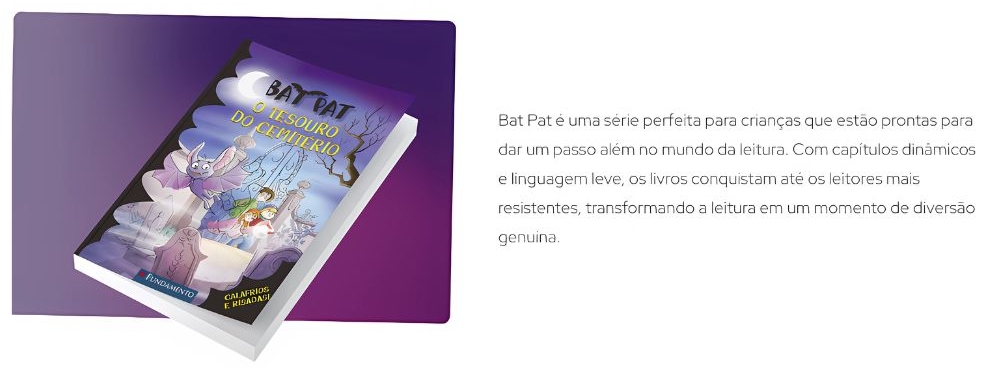 Você quer que seu filho saia na frente e chegue mais longe? Então ele precisa conhecer Bat Pat — uma série best-seller internacional indicada por educadores para crianças a partir de 8 anos. É o incentivo perfeito para trocar o videogame e o celular por uma aventura no mundo dos livros.
