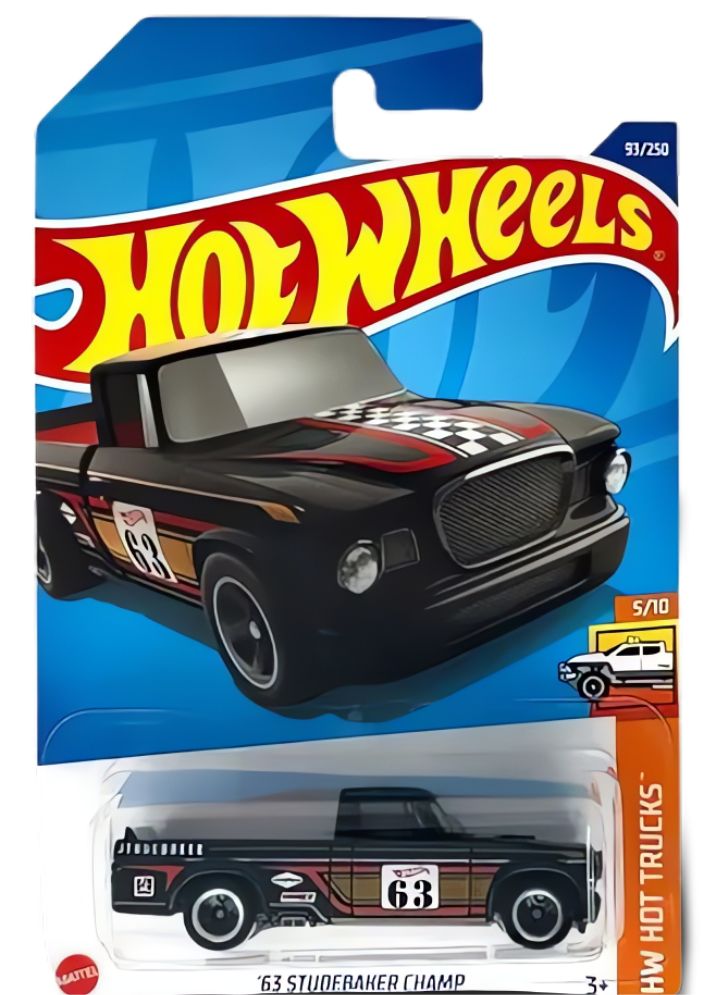 Miniatural colecionável. Hot Wheels '63 Studebaker Champ com referência HCT51 é uma miniatura da linha básica. Lançada em 2022 como parte da coleção HW Hot Trucks. Este modelo representa uma versão de corrida rebaixada da picape clássica dos anos 60.