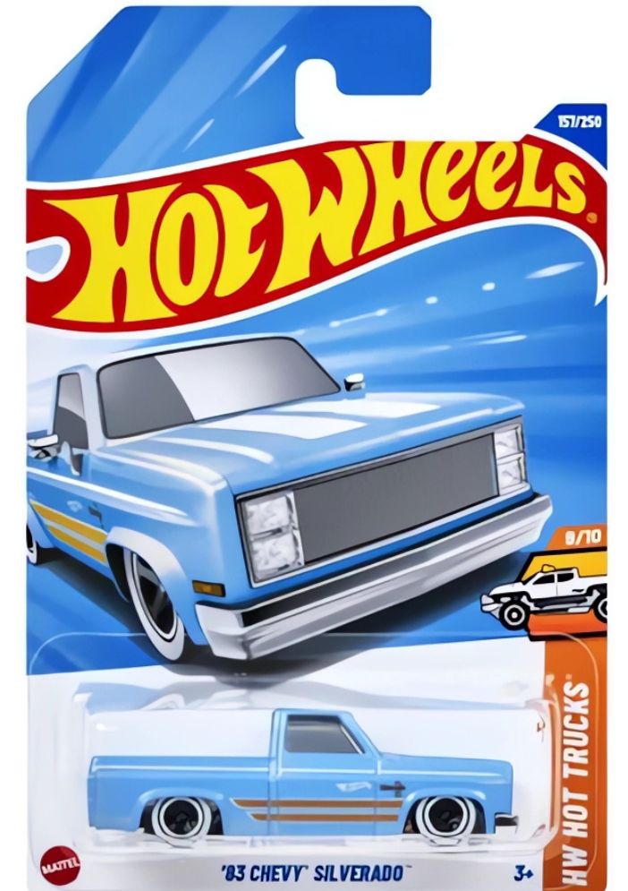 Hot Wheels '83 Chevy Silverado HYY91 é uma miniatura na escala 1:64, que pertence à coleção de 2025 da linha básica. O modelo faz parte da série HW Hot Trucks, é uma réplica da picape clássica da Chevrolet.