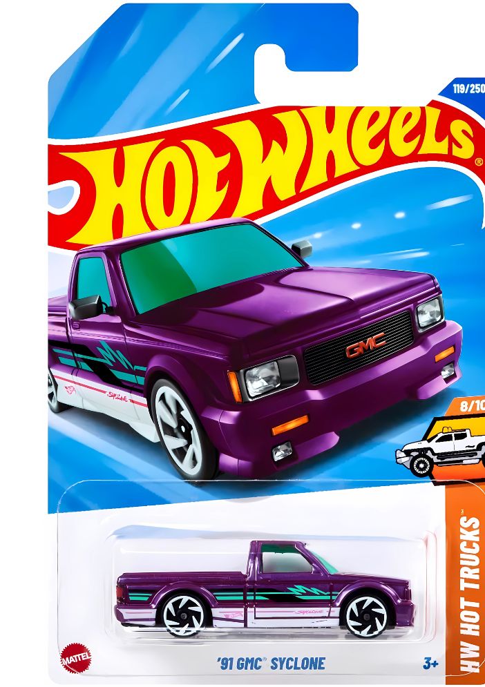 Hot Wheels - '91 GMC Syclone (Roxo) é uma miniatura colecionável da famosa picape. O modelo em questão é parte da série Hot Trucks de 2025 e tem a carroceria em metal fundido na cor roxa ou lilás.