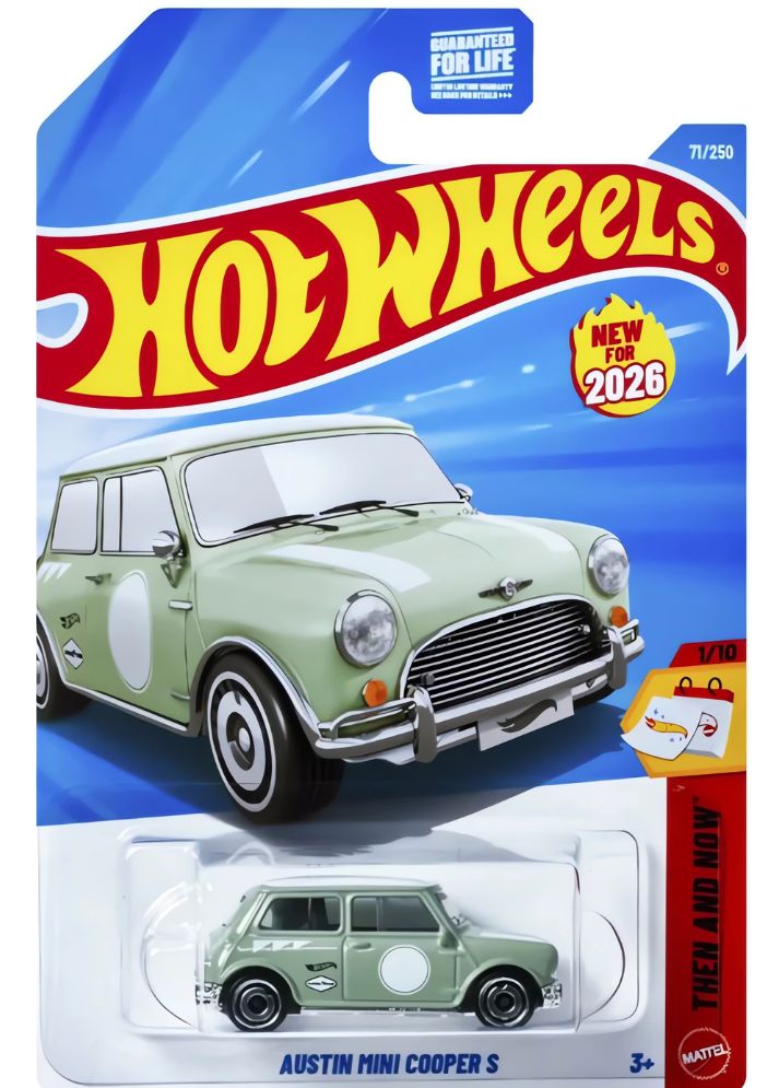 Hot Wheels Austin Mini Cooper S (JJH39) é um lançamento da linha básica de 2026, integrante da série "Then and Now". Este modelo é o número 1 de 10 da sua subcoleção e ocupa a posição 71 de 250 no ano.
