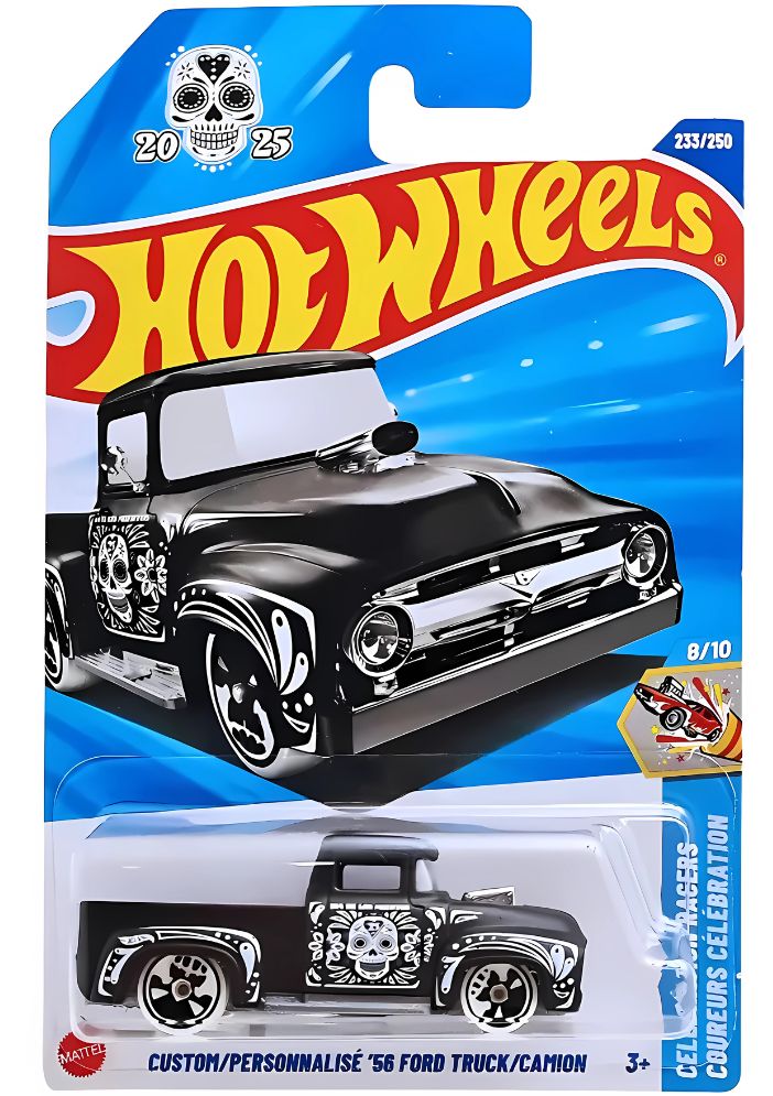 A miniatura Hot Wheels Custom '56 Ford Truck - JBB43 é uma peça colecionável na escala 1:64, lançada na série Celebration Racers e faz parte da linha principal da Hot Wheels. A sigla JBB43 refere-se ao código do lote do modelo. A miniatura é fabricada pela Mattel, feita de metal (diecast), e reproduz o visual de uma caminhonete Ford 1956 personalizada.