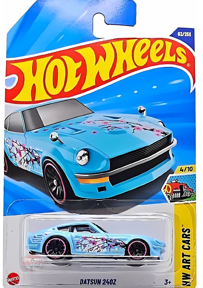 Hot Wheels Datsun 240Z (JJB80) é uma miniatura da coleção HW Art Cars da linha Básica de 2025. A miniatura em escala 1:64 tem a carroceria azul com pintura brilhante e um grafismo artístico de flores nas laterais.