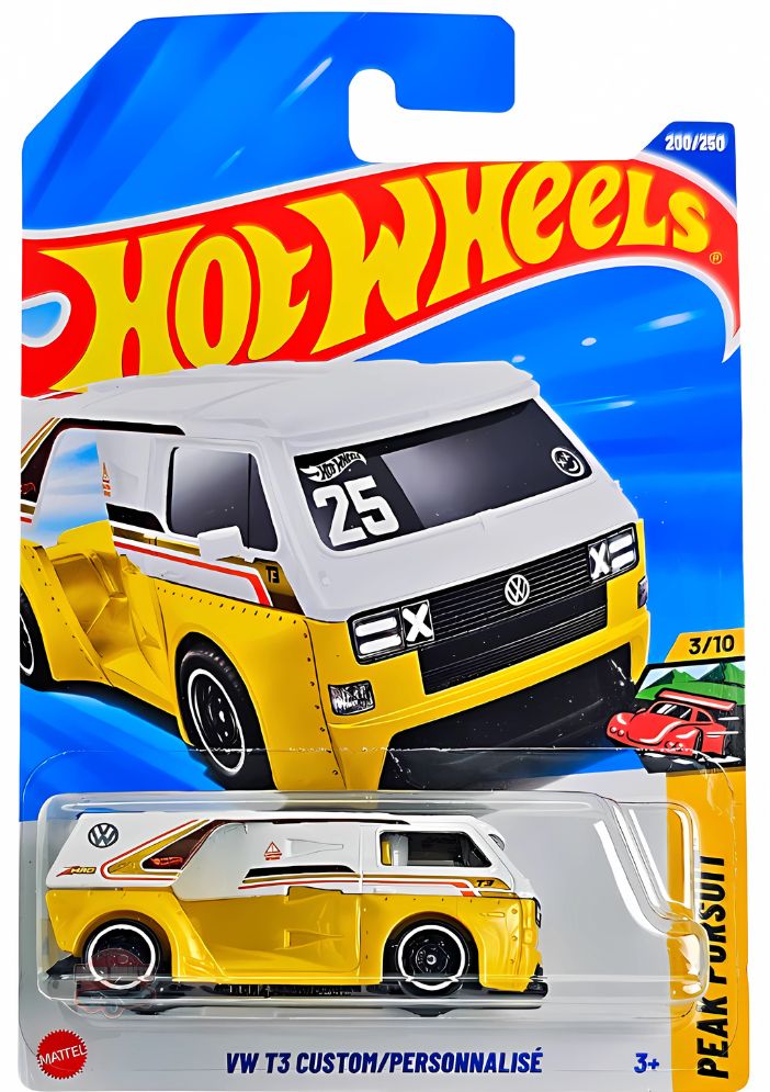 A miniatura Hot Wheels VW T3 Custom (Amarela), código JBC05, é um item colecionável trata-se de um modelo da coleção de 2025 e faz parte da série Peak Pursuit. A miniatura em escala 1:64 padrão da HW.